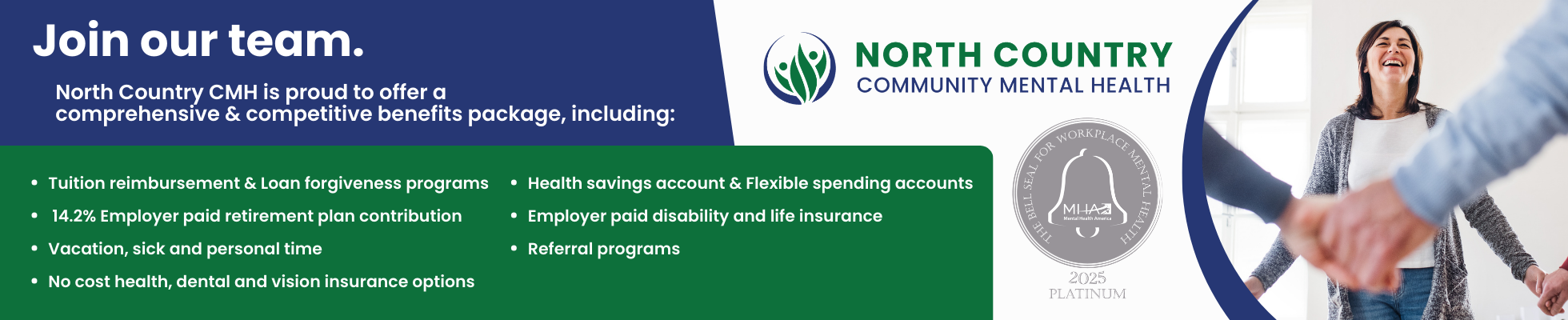 North Country Community Mental Health works with interns at the Bachelor and Master levels to assist them with the completion of their educational requirements in the discipline of Behavioral Health. We offer interns a program that includes a variety of opportunities with our wide spectrum of services within the behavioral health field. Every internship is individualized based upon the interests of the student.