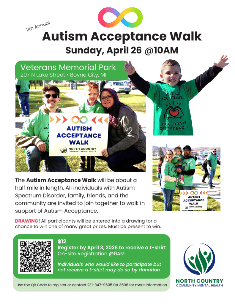 (Boyne City, Michigan) North Country Community Mental Health (NCCMH) is sponsoring its 11th Annual Autism Acceptance Walk on Sunday, April 26, 2026 at Veteran’s Memorial Park in Boyne City. On-site registration begins at 9:00 a.m. and the walk begins at 10:00 a.m. (approximately a half mile in length). Registration fee is $12. All participants will be entered in a drawing for a chance to win one of many great prizes including gift cards and special give-aways. Must be present to win.